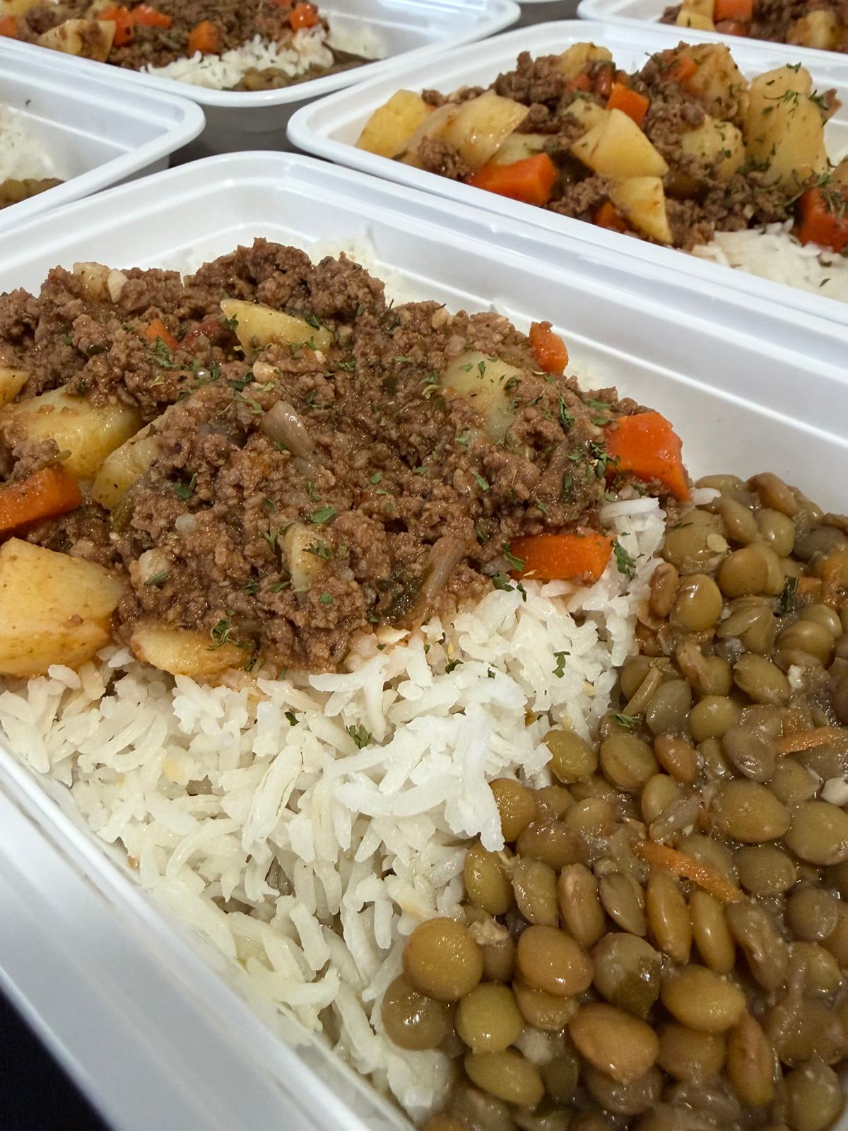 Carne moida com arroz e lentilha